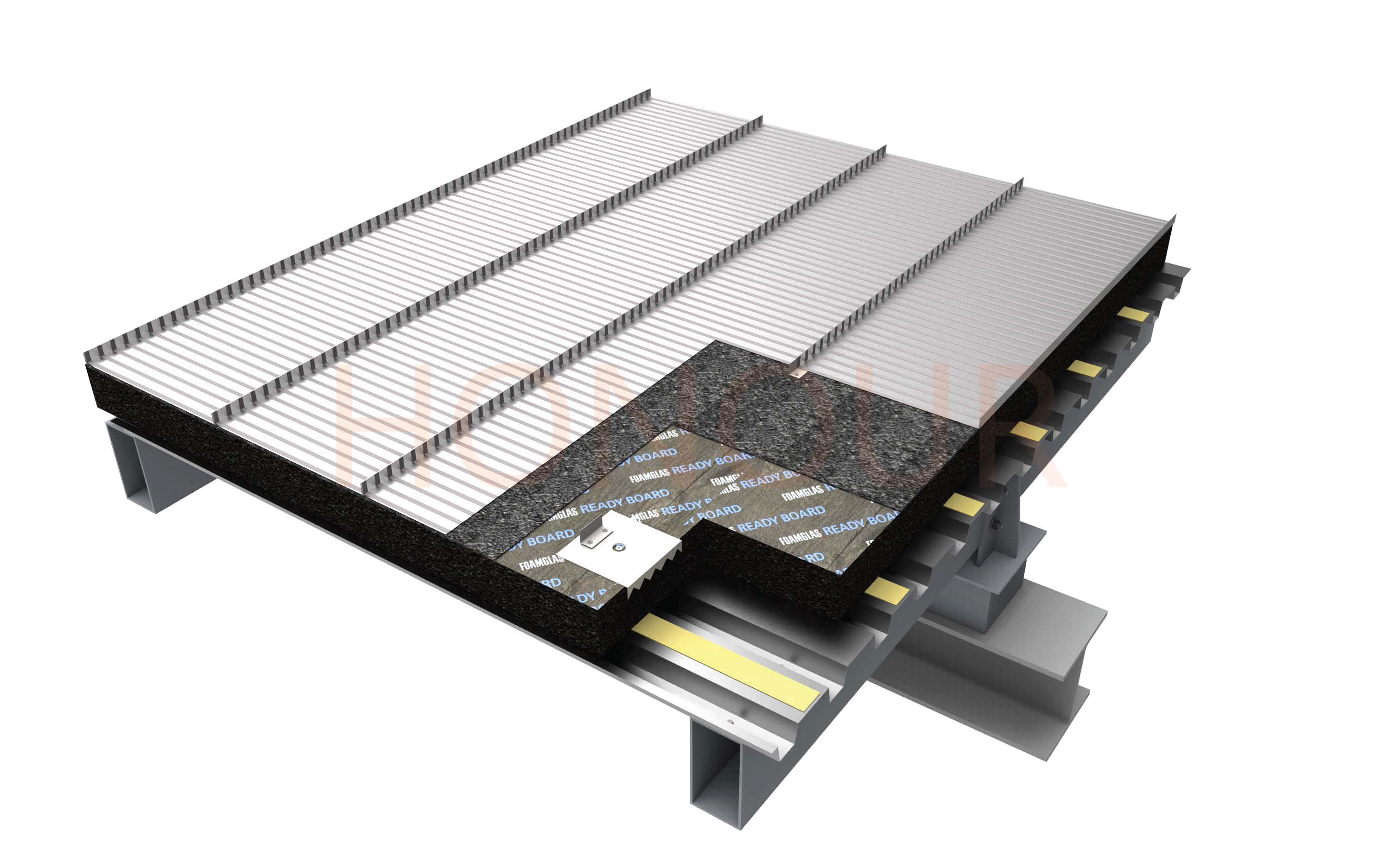 保温防水采用紧密型屋面系统,可以在钢结构、混凝土基层上使用